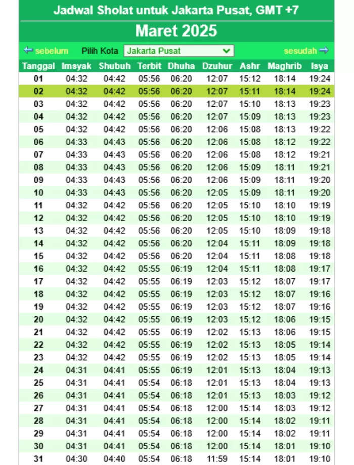 - 15 September 2025: Imsak pukul 4:21, Subuh 4:31, Dzuhur 11:51, Ashar 15:04, Maghrib 17:53, Isya’ 19:02