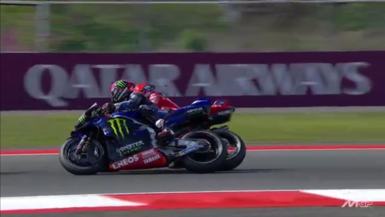 Insiden kontak langsung terjadi di tikungan 10, di mana Marquez membuat andalan Monster Energy Yamaha, Alex Rins sampai keluar jalur lomba.