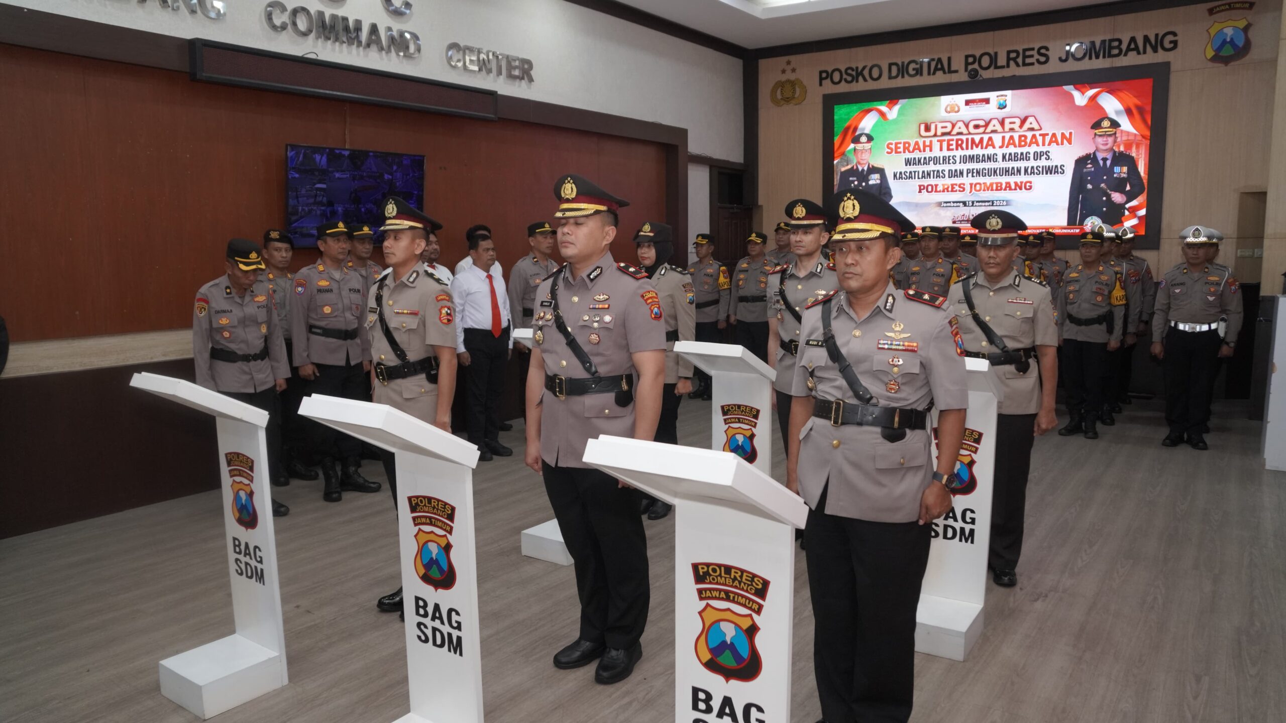 JOMBANG, Bangjo.co.id– Polres Jombang menggelar upacara serah terima jabatan (sertijab) Wakapolres, Kabagops, Kasat Lantas serta pengukuhan jabatan Kasiwas, Kamis (15/1/2026) pagi. Kegiatan berlangsung di Ruang Jombang Command Center Mapolres Jombang.