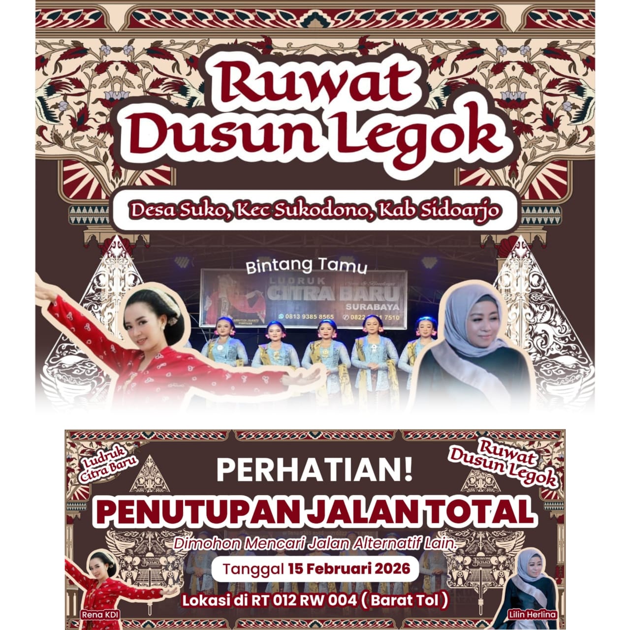 SIDOARJO,Bangjo.co.id – Kegiatan tradisi Ruwat Dusun akan kembali menghiasi Dusun Legok, Desa Suko, Kecamatan Sukodono, Kabupaten Sidoarjo pada pertengahan Februari 2026. Untuk memastikan kelancaran serta keamanan seluruh rangkaian acara, panitia pelaksana mengumumkan akan dilakukan penutupan jalan total di kawasan sekitar lokasi kegiatan, khususnya di wilayah barat Tol Suko. Masyarakat yang akan melewati daerah tersebut diimbau untuk menggunakan jalur alternatif yang telah disiapkan.