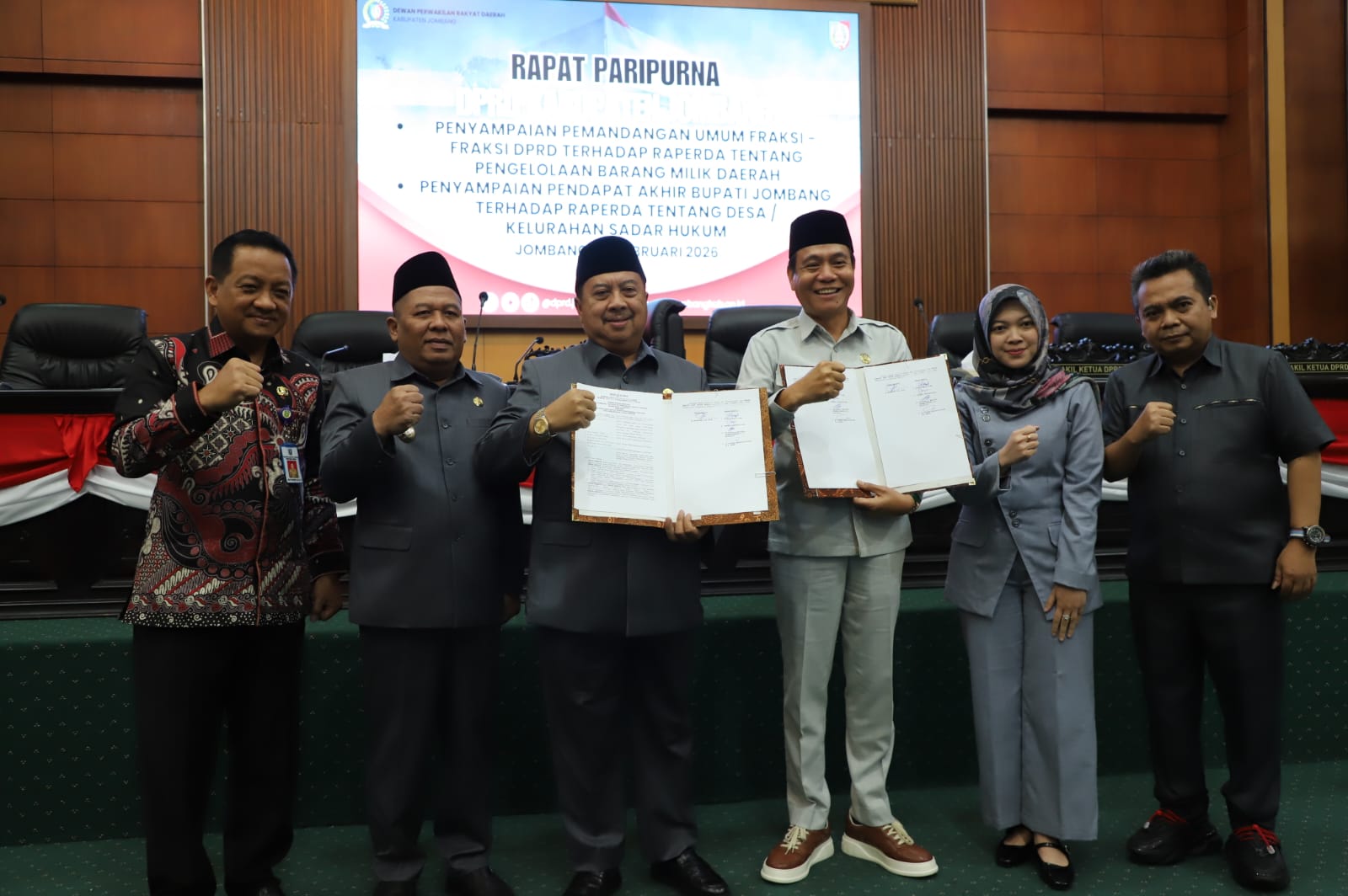 Rapat Paripurna kemudian diakhiri dengan penandatanganan berita acara persetujuan bersama antara Bupati Jombang dengan jajaran pimpinan DPRD Jombang, bahwa Rancangan Peraturan Daerah tentang Desa/Kelurahan Sadar Hukum, ditetapkan menjadi Peraturan Daerah sesuai dengan ketentuan peraturan perundang-undangan yang berlaku.